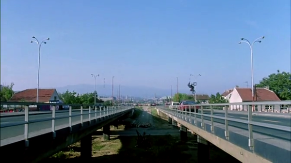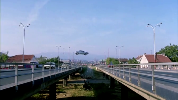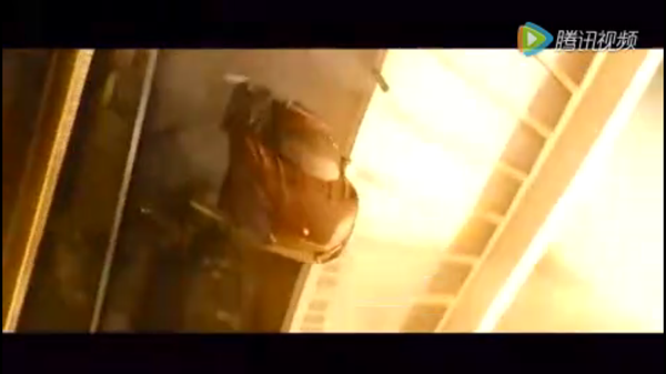 而这里面的这个摩托车飞车特技好莱坞是拍不出来的。这是真人开车飞过桥完整的一个镜头,没法切成几段,空中放假人,后期合成。