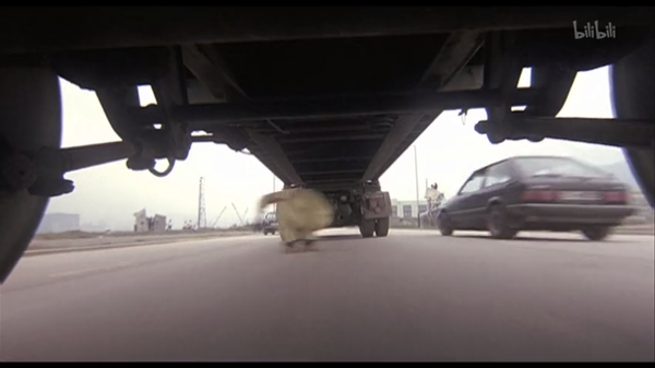 滑旱冰从行驶的货车下滑过。一扭倒,就是被车轮轧死。