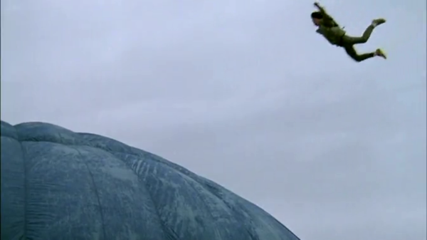这个镜头已经成为影史经典,掉威亚能解决飞上天的问题。落地只能是自己往下跳,利用两层布减小重力。据成龙说这个镜头7天自己都没有拍,因为害怕。