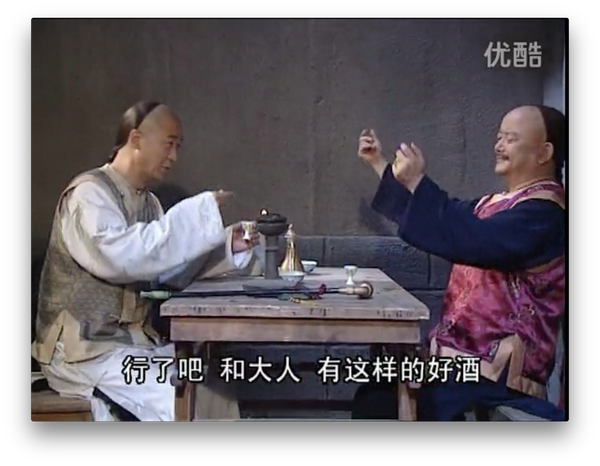2.纪晓岚要骗和珅的银子做会试的经费,请皇上假扮酒保,诱和珅说出心里话。酒桌之上,王刚先是把当时处于顶峰的和珅的意气风发之态及心理表现得淋漓尽致——