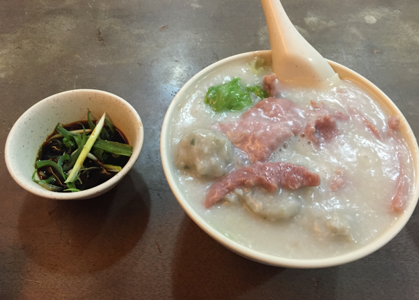 鲮鱼丸牛肉粥:鱼丸大个,用料实在,牛肉新鲜,粥底熬的非常到位,搭配一碟酱油葱,沾鱼丸吃,去腥提鲜。喝的一点都没剩下。