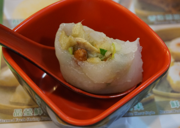 潮州蒸粉果:对粤菜菜系并不熟悉,从口感猜测里面有鸡肉、榨菜、花生、青菜等,融合在一起,皮子是透明的,好看也好味。