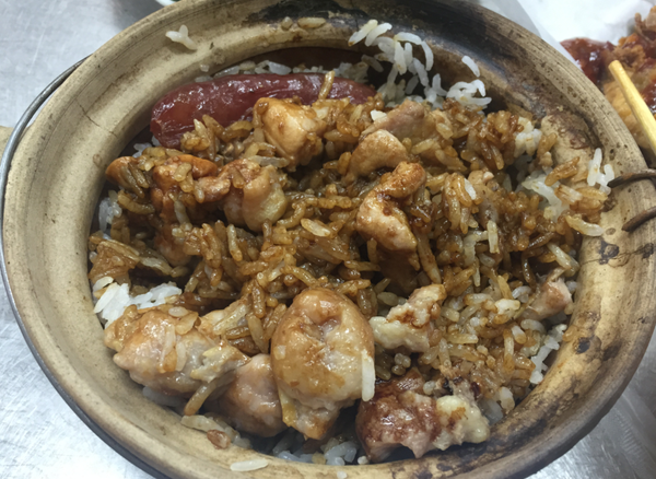 滑鸡腊肠煲仔饭:炭火煲仔饭,用破旧的砂锅端上来,打开听到刺啦作响的声音。腊肠的油脂渗进米饭里,加了海鲜酱油拌着吃。味道还不错,不过并没有想象的那么好吃。邻桌一对香港情侣吃的时候在里面加了生鸡蛋与米饭拌好盖上盖子闷了一会,看起来这种吃法可能更地道。对于南方菜式并不熟悉。