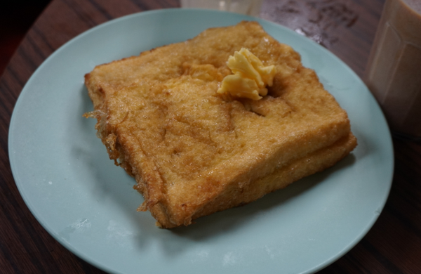西多士:面包裹了鸡蛋液煎好,上面涂了一小块黄油。服务员端上来说要沾桌上的蜂蜜吃,切成小块,挤了一圈蜂蜜,舌头已经飞上云端。