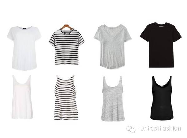 纯白T、条纹T、纯灰T、纯黑T,4款当中至少有2款,半袖、无袖都可以,我个人偏好半袖