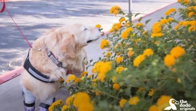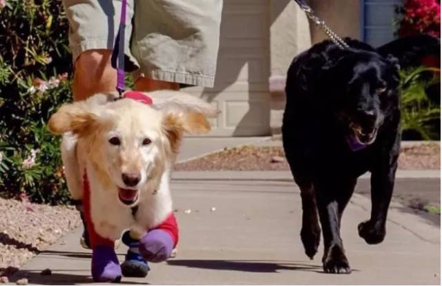 以前行动不便,它只能眼巴巴望着其他小伙伴出去玩耍,现在它能和他们一起出门。