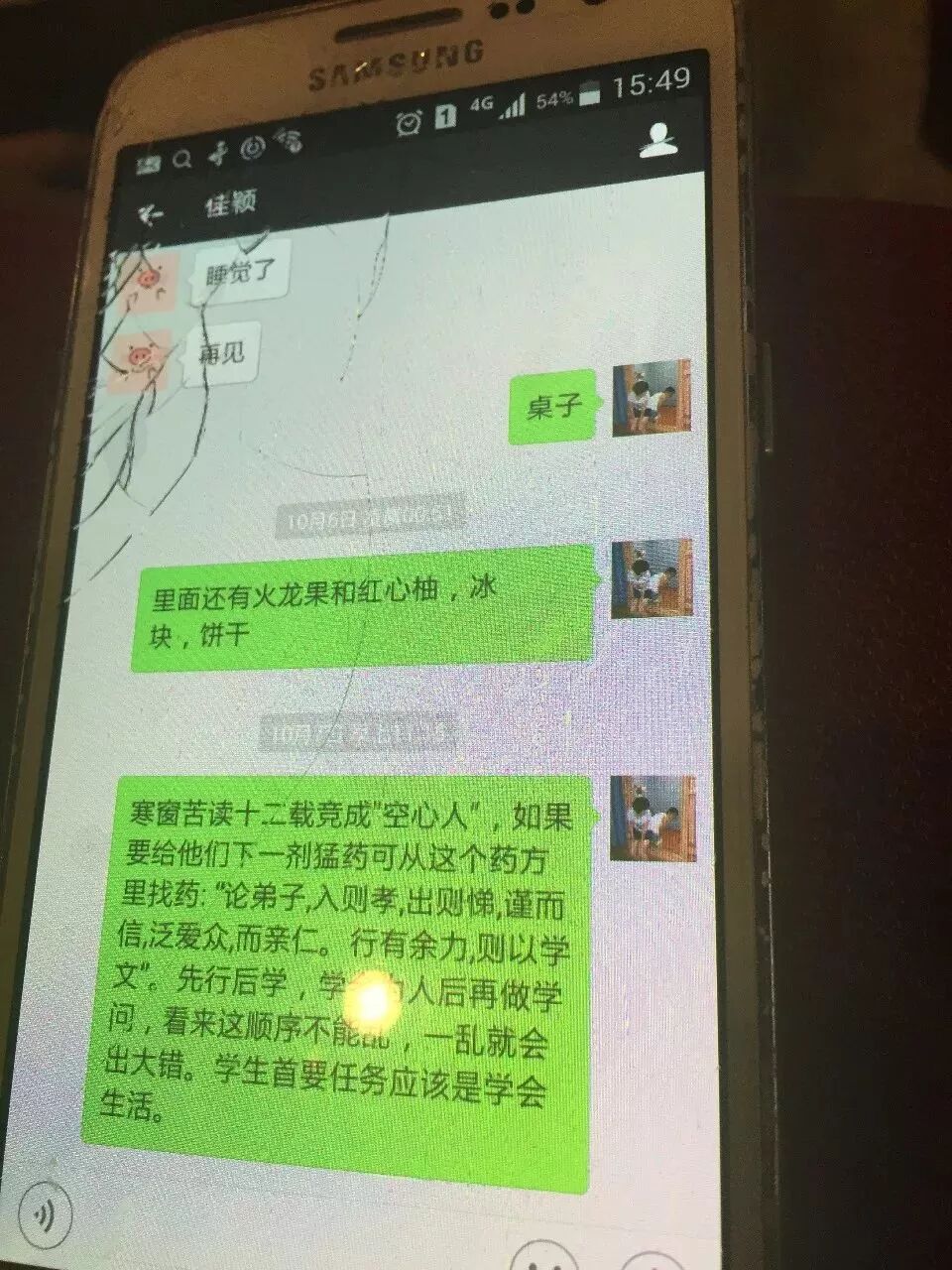 接着是10月7日的那条190字的长微信,苦口婆心劝说女儿:“寒窗苦读十二载竟成‘空心人’……学生的首要任务应该是学会生活。”