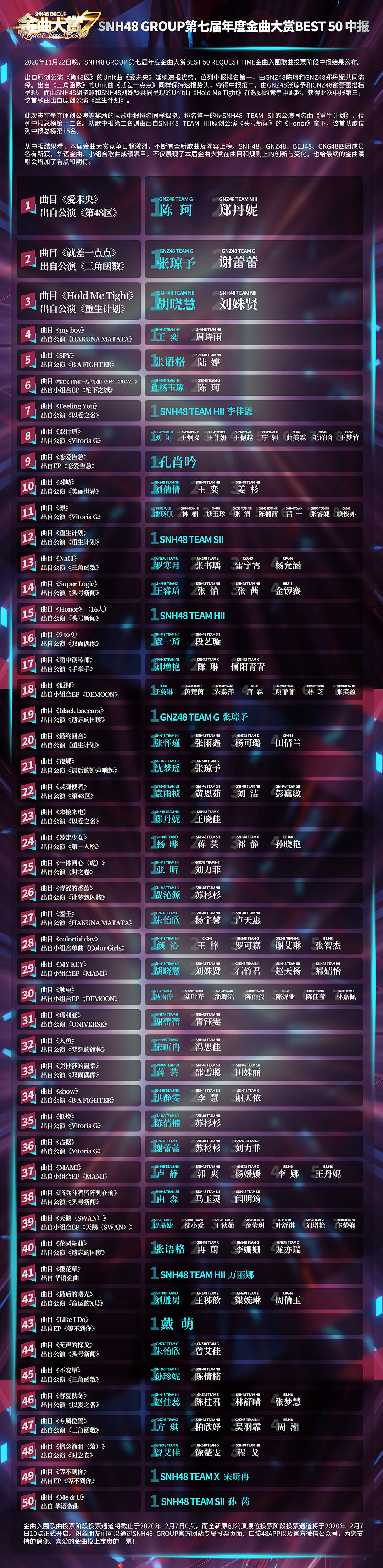 11月22日晚,SNH48 GROUP第七届年度金曲大赏BEST 50 REQUEST TIME金曲入围歌曲投票阶段中报结果在SNH48星梦剧院公演现场公布,主持人徐晨辰现场宣布了截止至11月22日17:00暂居前50名的歌曲、演唱组合和成员顺位的名单。