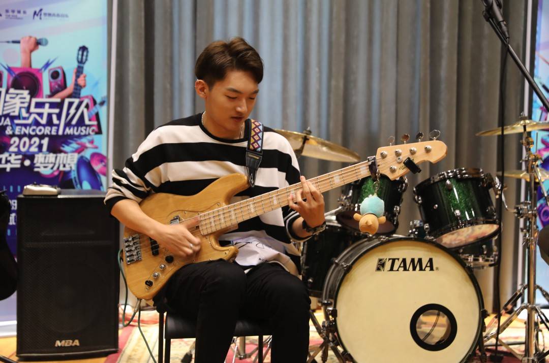紧接着7号孙逸浩展示了吉他弹唱,他幽默风趣的性格让面试充满了欢乐,当才华和有趣的灵魂结合,果然会碰撞出精彩的火花;而相对于较为大众的弹唱,26号孙首地带来的一段贝斯solo将整个活动推向了新的高潮,他那让评委都忍不住赞叹的技术是用无数次练习堆积起来的结果;15岁的高兴是本次活动最小的选手,虽然年龄不大,但学鼓多年,并且已经是一位优秀的原创爱好者。