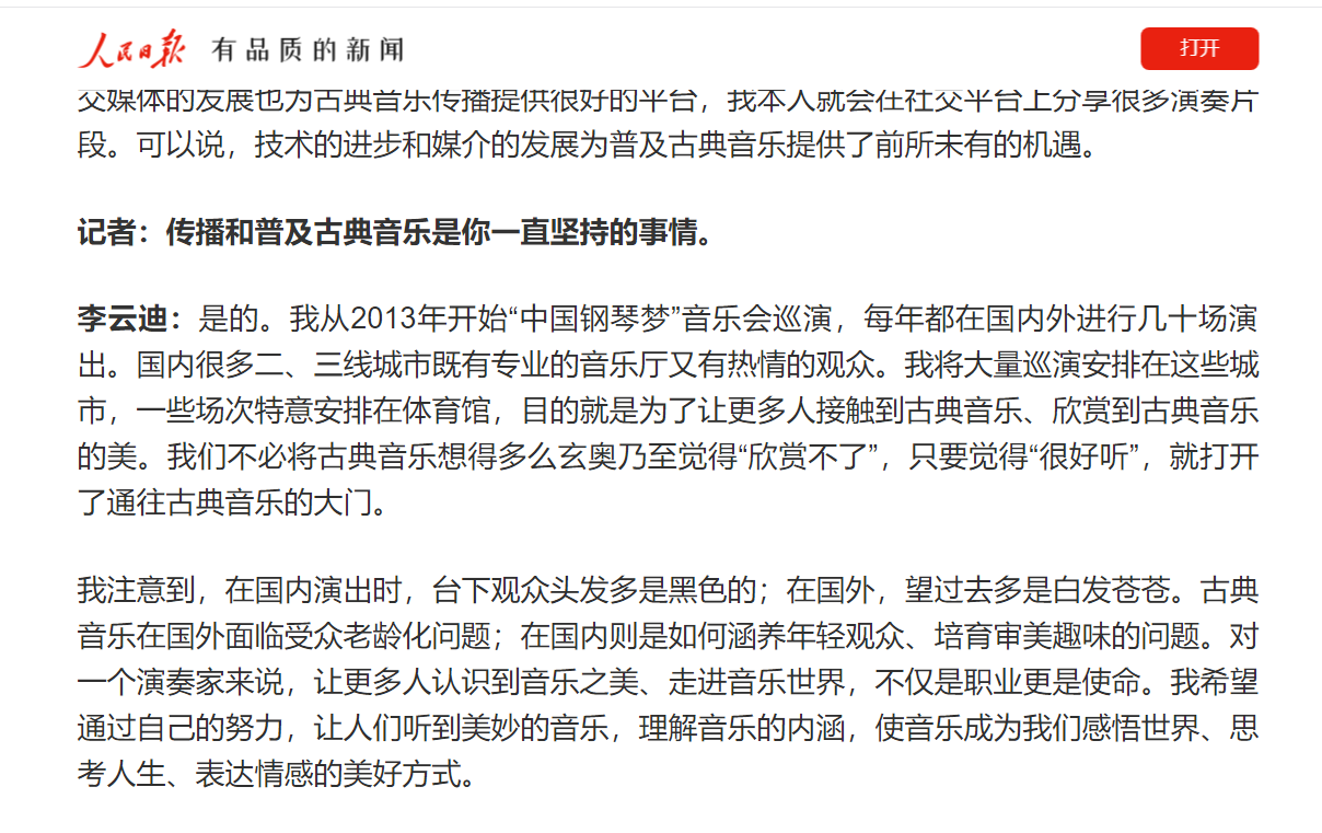 在与《人民日报》的对话中,李云迪表示传播和普及古典音乐是他一直都在坚持做的事,从2013年到2019年,他接连举办了 “中国钢琴梦”、 “王者幻想”、“肖邦传奇”、 “云指肖邦”、“李云迪·奏鸣曲”等多场音乐会巡演,每年都在国内外进行几十场演出,更把大量巡演都安排在了国内二、三线城市,以便让更多人接触到古典音乐、欣赏到古典音乐的美。