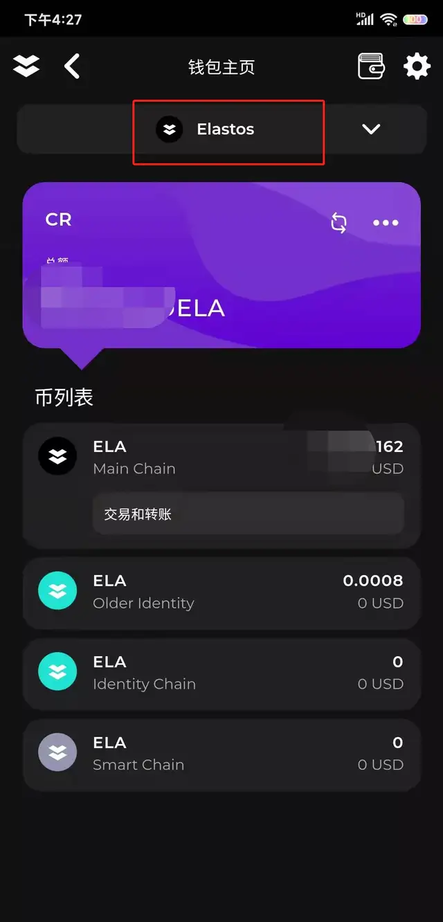 1.打开 Elastos Essentials ,切换到 Elastos 网络,选择主链 ELA,点击“交易和转账”。