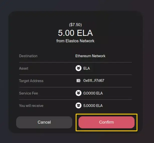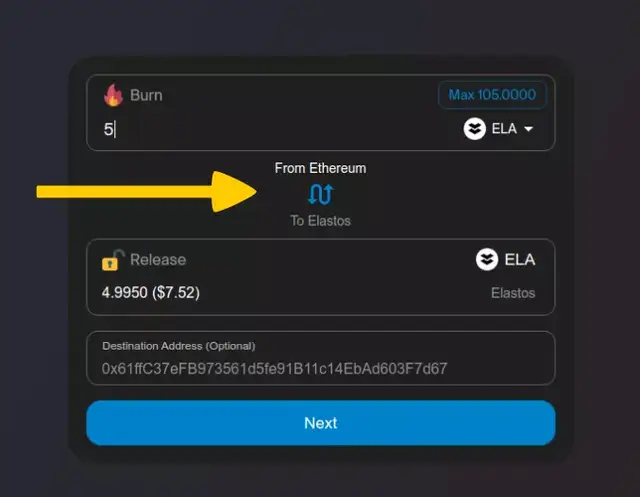 要将以太坊上的 ELA 转移到 Elastos ,只需重复与上面相同的过程。现在。您可以在以太坊上烧毁 ELA 代币,并将原来的 ELA 释放回您的账户。但是,从以太坊上发起转账,GAS 费会高很多(需要更多的确认),所以要相应地做好计划。