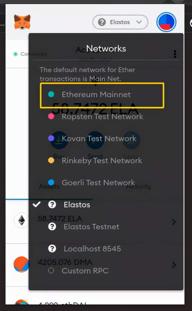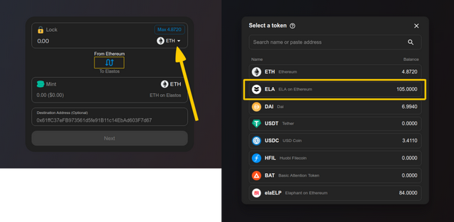 要查看您在以太坊上创建的 ELA,请单击“ETH”下拉菜单,打开默认令牌列表并选择 ELA。