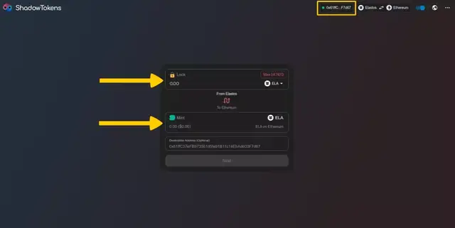 1. 连接钱包(MetaMask 或 WalletConnect )到 Elastos 网络。连接网络后,您的地址将会显示在右上角导航栏。同时,ELA 余额位置显示“Max”按钮。并且,页面将显示两个 ELA 余额,上面的余额表示主网络(Elastos)上的资产,下面的余额表示意向网络(以太坊)上的资产。