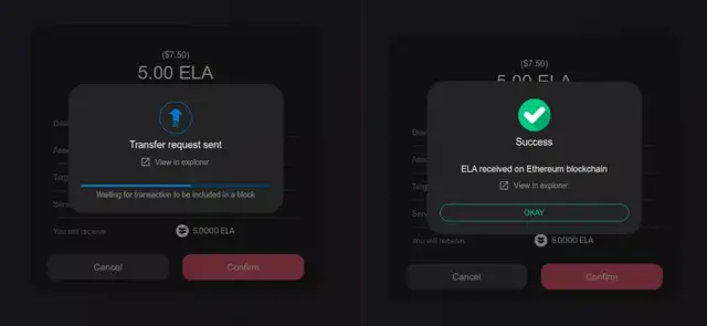 注意:转移 ELA 和 ETH,不需要授权。但是,对于 ERC-20令牌,首先会有一个支出授权请求,以允许智能合约从令牌合约中检索资金,然后是第二个请求,用于实际的网桥转账。