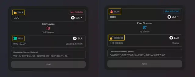 同时,页面还有“锁仓”、“释放”、“烧毁”和“铸造”的标识,这些将根据您选择的资产而改变。在这种情况下,ELA 将被锁定在 Elastos 链上,其影子代币(以太坊上的 ELA)将在以太坊链上按1:1的比例铸造,并由中介智能合约管理。当 ELA 被转移回来时,“以太坊上的 ELA”令牌被烧毁,本地 ELA 被释放到 Elastos 侧链上的地址。这一原则适用于所有的资产转移。