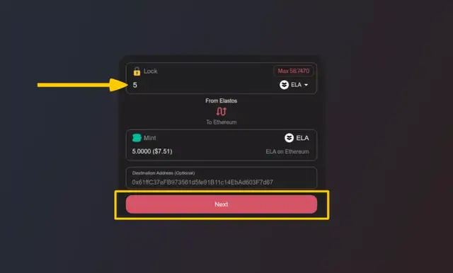 2. 输入您希望转移到以太坊的 ELA 金额,最低转账金额是1 ELA。需要注意的是,ELA 的功能就像 Elastos 侧链上的 GAS,所以要保留一些来支付小额交易费用。当您输入有效的金额时,“下一步”按钮被激活,点击它。