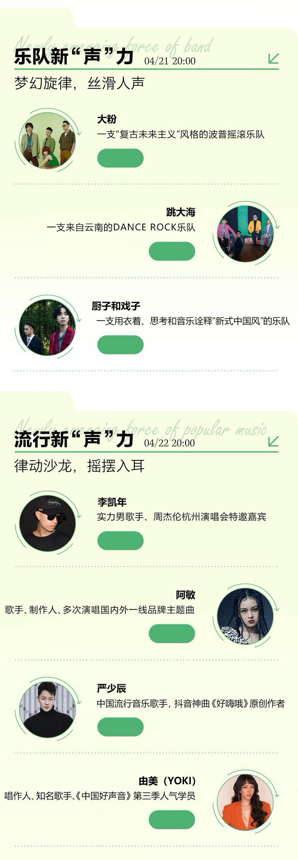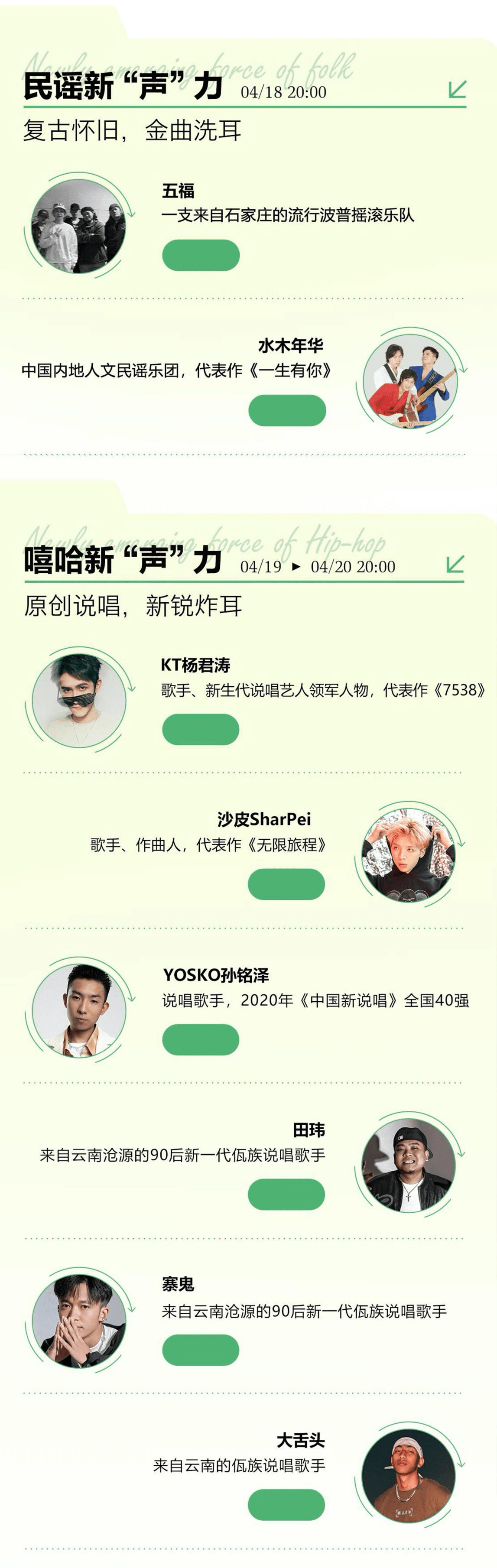 本次线上音乐节阵容强大,令人沸腾,如水木年华、五福乐队、KT杨君涛、沙皮SharPei、YOSKO孙铭泽、田玮、寨鬼、大舌头、大粉乐队、跳大海、厨子和戏子、李凯年、阿敏、严少辰、由美等。15组实力派音乐人&乐队,风格囊括民谣、嘻哈、摇滚、流行等等,历时5天,共15场,里面一定有你的热爱和期待,届时网易云音乐也将在4月18日--22日每晚20点准时为大家进行全程独家直播,现已开启直播预约。
