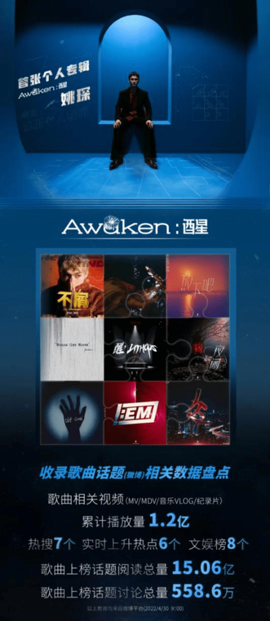 此前,姚琛个人首张实体专辑《Awaken : 醒》音源全部公开,专辑共收录包括《不屑·NEVERMIND》、《醒·LITHOPS》在内的9首歌曲,歌曲相关视频微博累计播放量1.2亿,共斩获微博热搜7个、实时上升热点6个、文娱榜8个的不俗成绩!词曲兼修,打造个性电子风音乐,此次个人首张实体专辑更是姚琛迈向音乐制作人的重要一步。