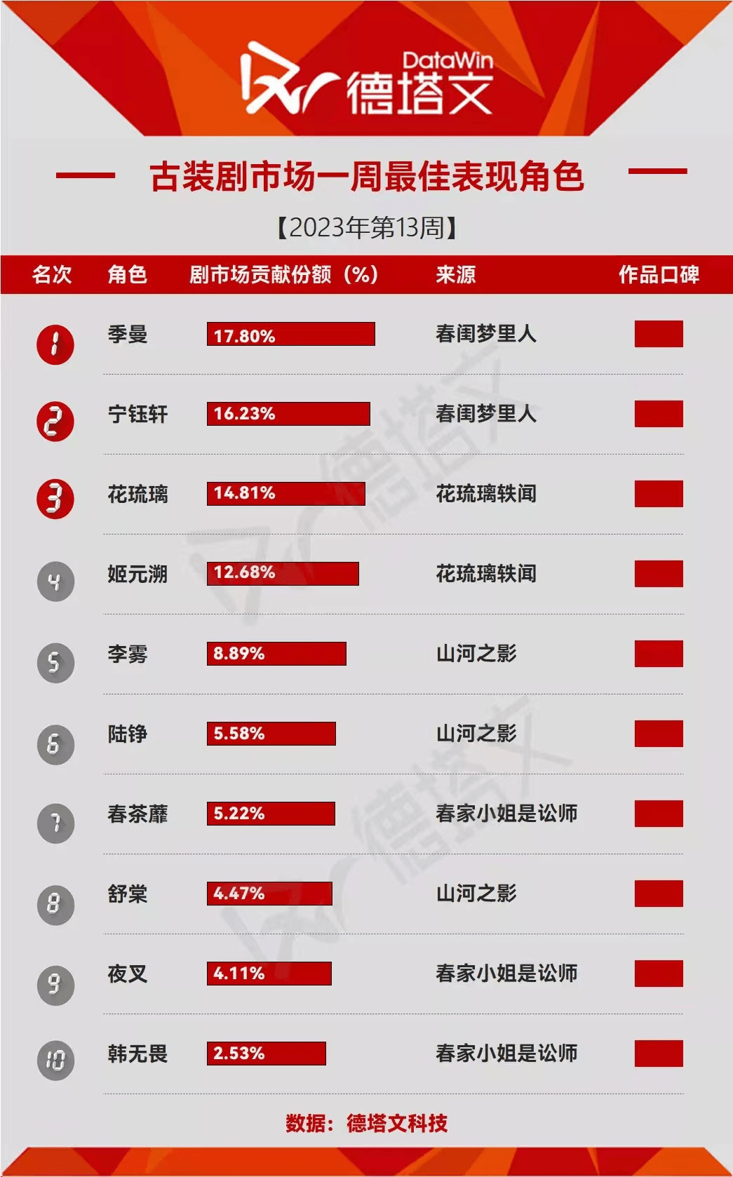 由彭小苒领衔主演的新剧《春闺梦里人》在开播期间广受好评,剧情已过半热度仍然持续飙升,获得德塔文古装剧景气指数第一。彭小苒饰演的角色季曼也凭借17.8%的剧市场贡献份额,获得德塔文古装剧市场一周最佳表现角色。