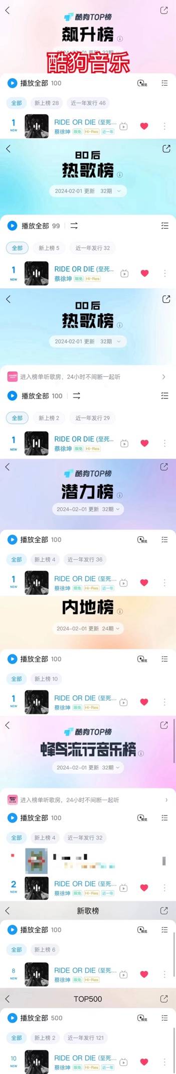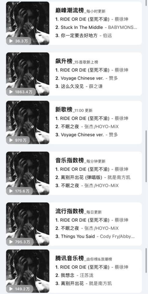 在腾讯音乐由你榜上,《RIDE OR DIE(至死不渝)》荣登冠军,实时综合得分高达95.89,充分展现了其在音乐榜单上的强大实力。同时,QQ音乐巅峰潮流榜、飙升榜、新歌榜、音乐指数榜、流行指数榜均一举登顶,蔡徐坤的新作品在QQ音乐上全方位的获得好评!