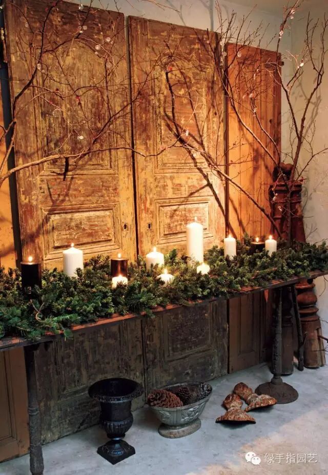 用在山里拾到的美丽枝条装饰蜡烛的背景,桌子上铺满了常绿的云杉。充满野生情趣的美丽树枝成为了奇妙的装饰物。