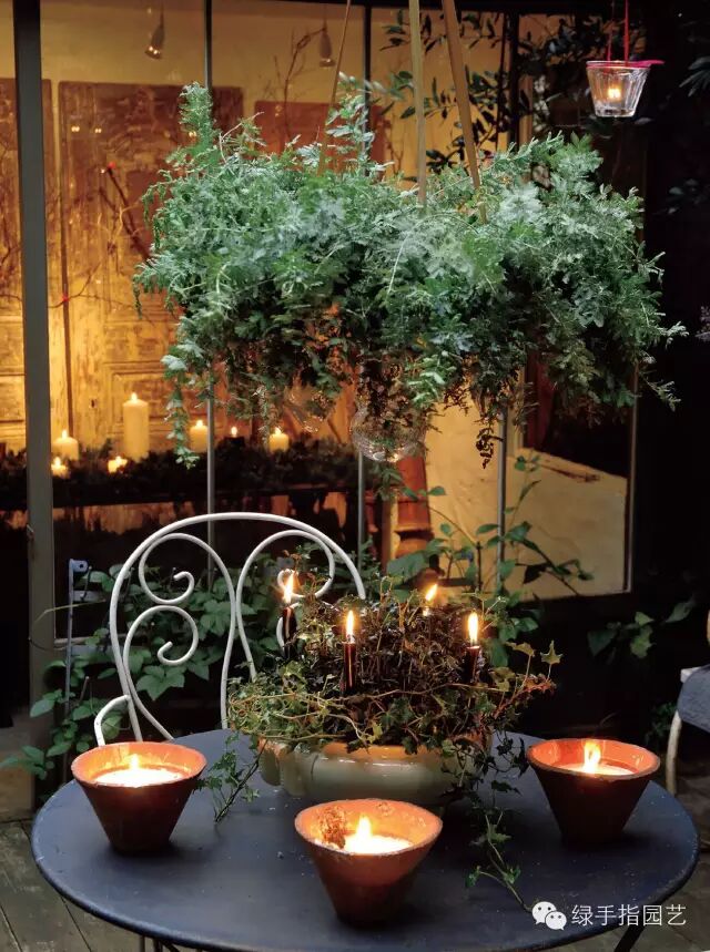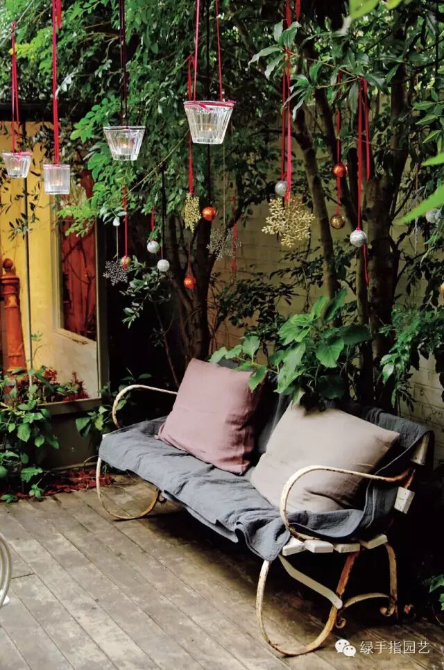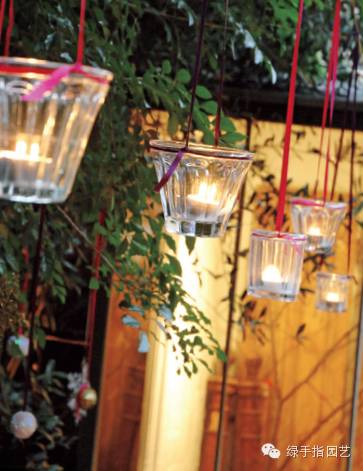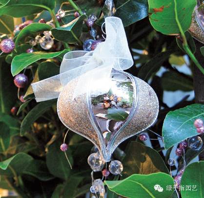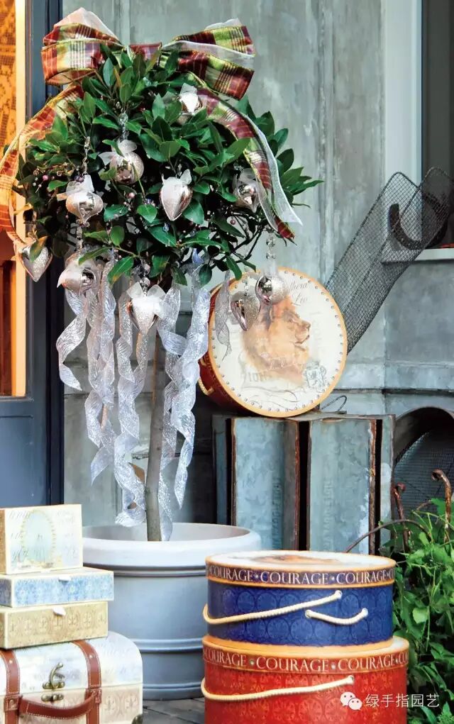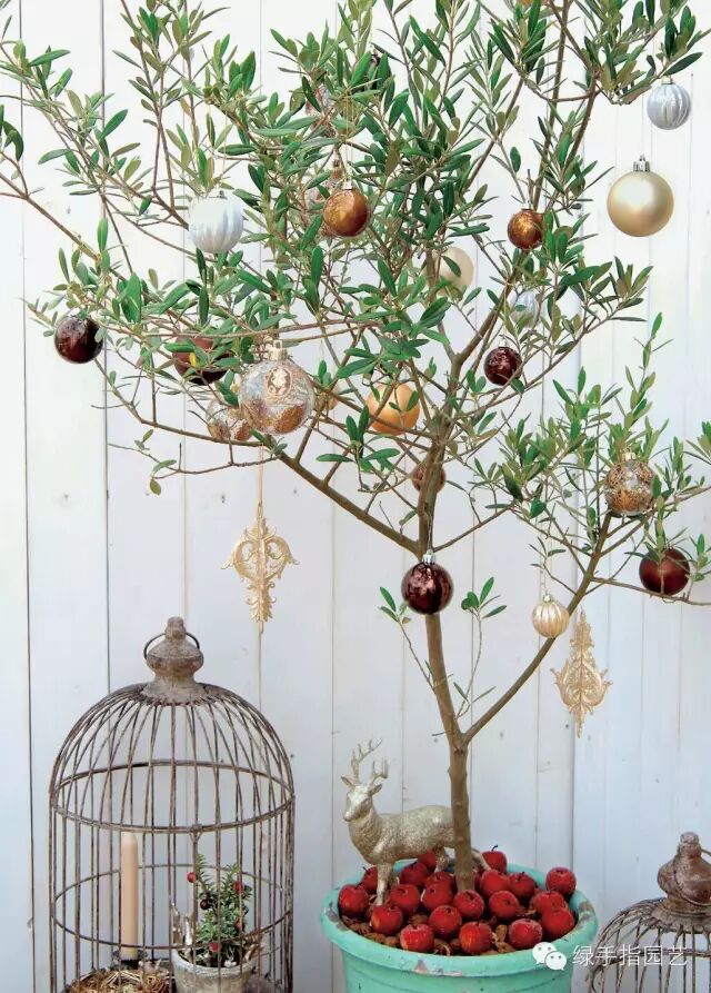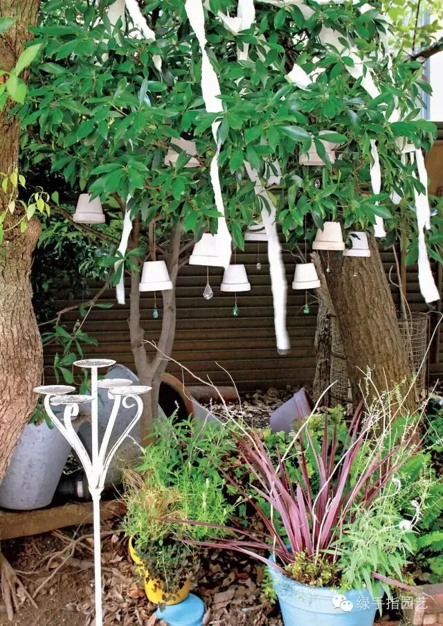 在花园里选择一株刚刚高过自己身高的常绿树,将它瞬间变身为美丽的圣诞树。将陶盆涂刷成做旧的白色,用铁丝挂在树上。悬挂的时候要注意在树木高处或是枝条尖端不悬挂花盆,免得给枝条增添负担耷拉下来破坏整体的株型或是被枝叶遮挡,花盆的颜色根据喜好自由搭配,以享受到原创制作的乐趣。