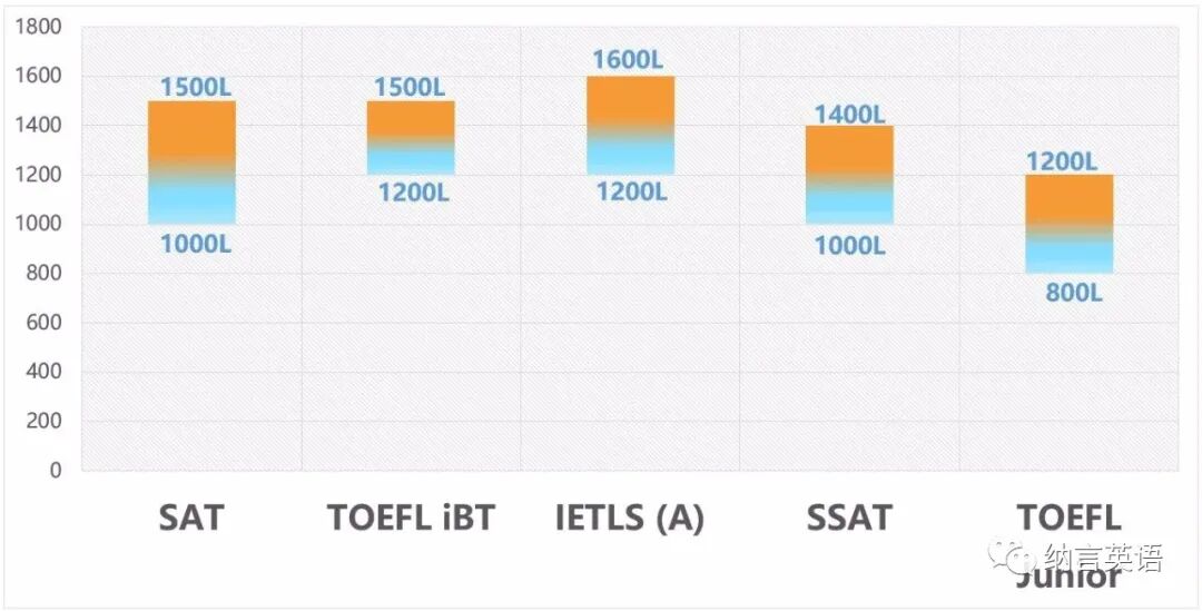 国际类考试阅读部分的难度从800L到1600L,尤其高中阶段及以上考试的阅读部分难度平均在1300L-1600L之间。中国初三学生英语阅读水平在500L,高三学生英语阅读水平在790L,与托福,雅思,及SAT考试阅读部分的难度相距甚远。