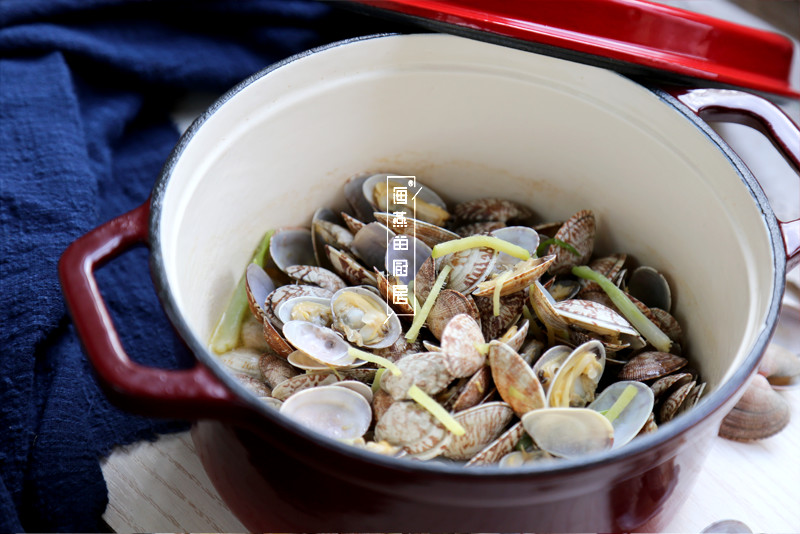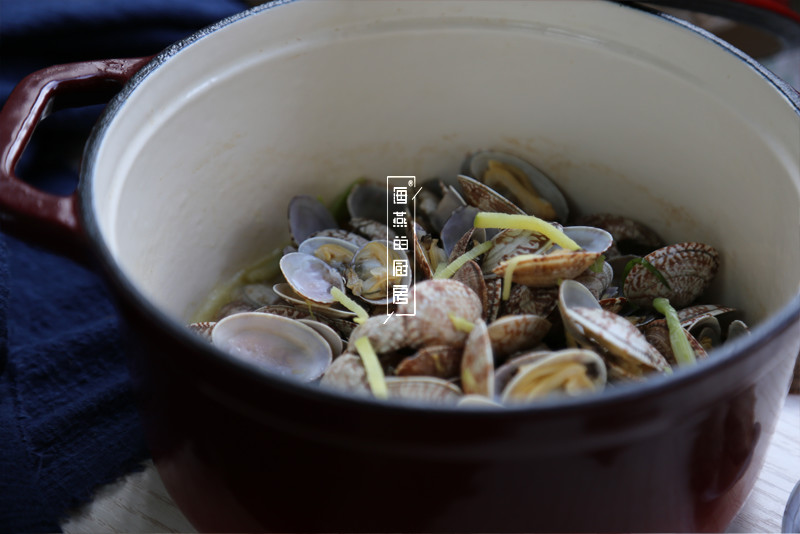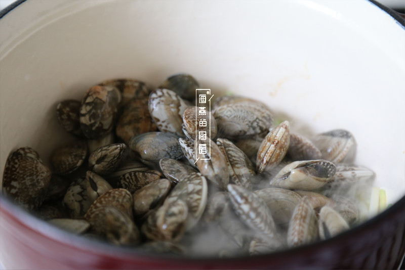 紧接着把洗净的蛤蜊倒入锅中,加入白葡萄酒后盖上锅盖焖2分钟左右