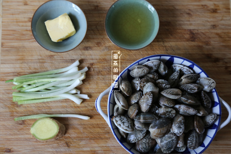 花蛤500克,香葱段少许,生姜半个,白葡萄酒适量,黄油20克,盐少许