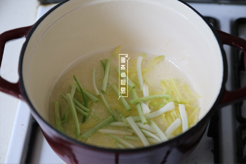 铸铁锅加热后倒入薄薄的一层油,放入姜丝,葱白段烹出香味