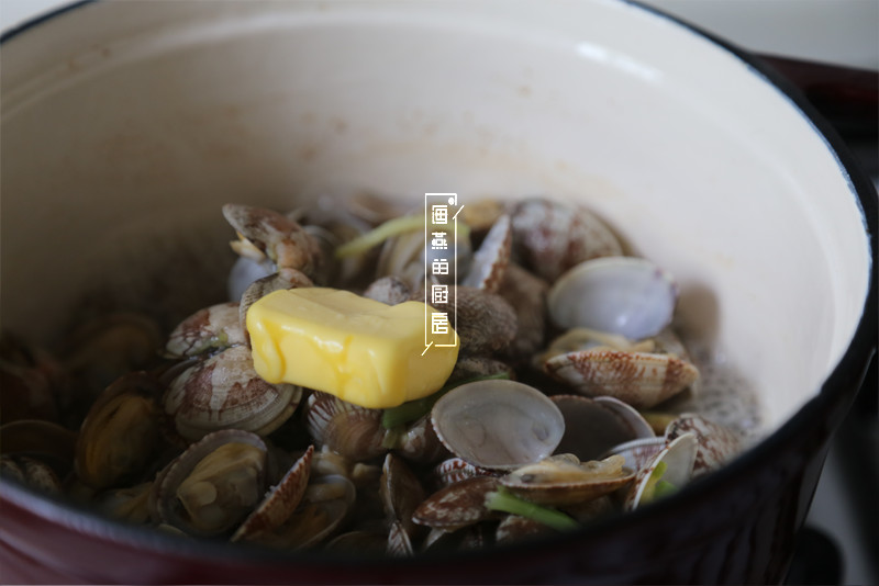 接下来用锅铲翻动蛤蜊,放入事先准备好的黄油,再盖上锅盖焖一分钟