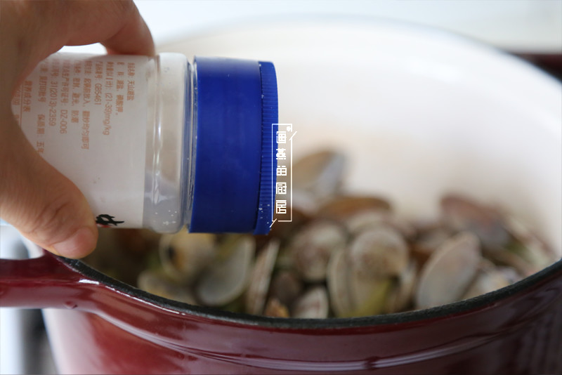 第二次打开锅盖后蛤蜊已经全部开嘴,调入少许食盐翻拌均匀即可食用