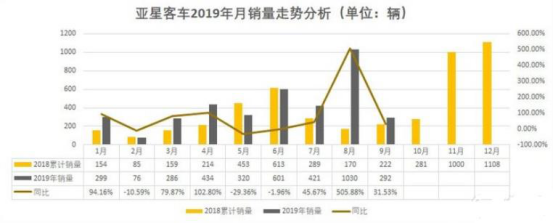 亚星客车在2019年的整体市场表现可以说是较为稳定的一家上市车企,从整体的市场表现上来看,今年上半年亚星客车的市场销量中还是表现不错,特别是今年下半年8月份的市场销量增长,带动了整体的增速。