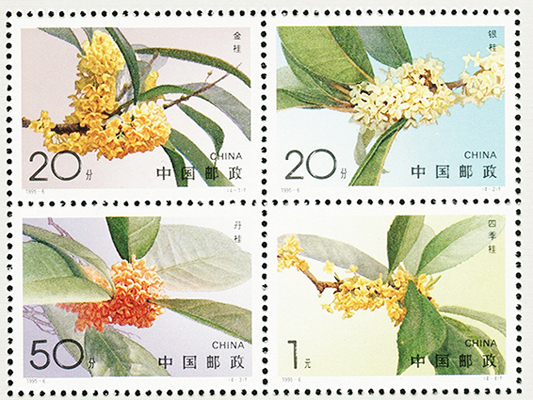 1995年4月14日,中国邮政发行《桂花》特种邮票,全套共4枚,分别为金桂、银桂、丹桂和四季桂。这套邮票采用水彩画技法,又结合中国画传统的折枝形式,对花、叶和枝进行了大胆的艺术处理,生动地表现出了桂花的娇艳。