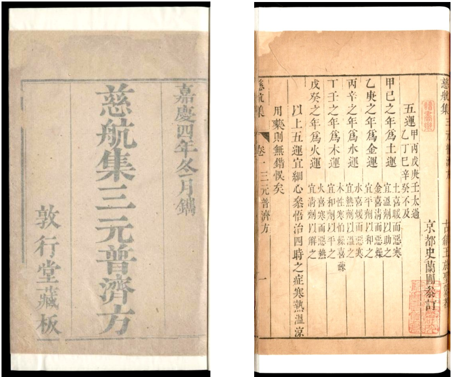 所谓精,即指尽量通过全面调研比对,版本选择精刻精印本,如明代张鹤腾所撰《伤暑全书十卷》,原书现存明天启六年(1626)刻本已收录于《续修四库全书》中,而另一明刻本刻印校对不精,故选清康熙十四年(1675)大兴林起龙刻本,该书校印精详且为存世孤版,书后又附有清代喻昌《瘟疫论》、明代邵弁《运气占候补遗》,并辑录《疫证治案》《治疫名方》,内容丰富,版本精良。版本的精善还体现在初刻本、自刻本、家刻本和家塾刻本上,因为是作者在世时亲自督导校印或者是家族中人职司校雠刊行,所以刻印质量较书坊和后世翻刻重刻本为高,且对文献传承具有重要价值。如清代刘奎所撰《松峰说疫》初刻本不知所踪,我们通过调研发现,清乾隆五十七年(1792)其与《瘟疫论类编》合刻于江宁,而且后来的著录为清嘉庆四年(1799)刻本,内封题为“本衙藏版”的版本即是此初刻本撤换扉页后的后印本,考订理清了此书初刻本版本的传承。又如,清代温病四大家吴鞠通编撰的《温病条辨》,我们选用的是清嘉庆十八年(1813)问心堂初刻本,此本由吴鞠通本人精校并主持刊印,版本和学术价值上乘;清代戴天章《广瘟疫论》收录的是清乾隆四十八年(1783)上元戴祖启家刻本,是由戴天章的孙子戴祖启主持刊刻,为家藏精刻本。此外还收录了商会、药堂、救济局等公私机构的刻印精品,体现了温病防治中社会力量的重要作用。