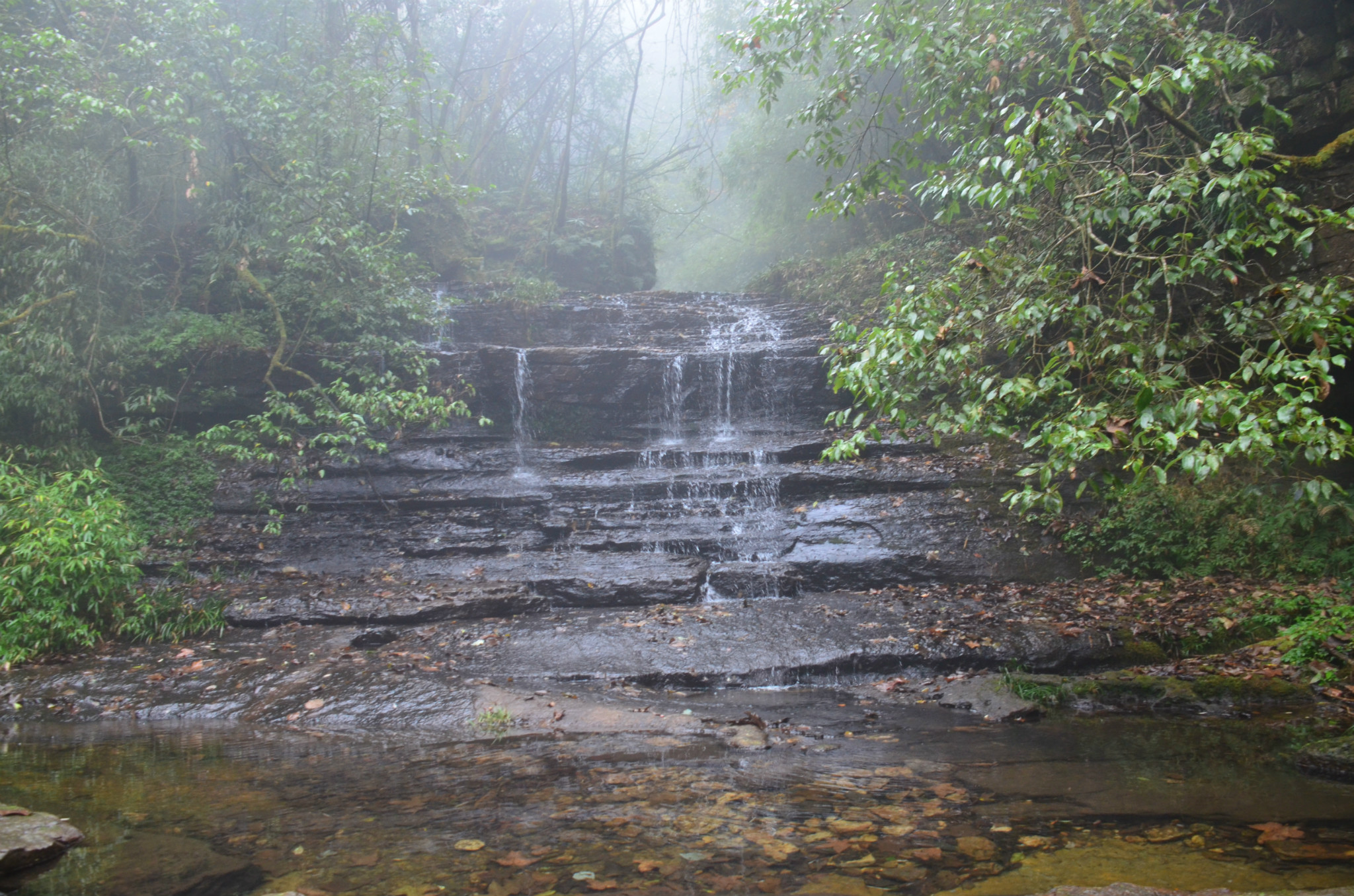 水不深,沿着河床肯定可以寻找瀑布。和树叶,流水一起散步,河床走了十多分钟,就到了河道的尽头,看到了两股小瀑布,我称之为珍珠瀑布。