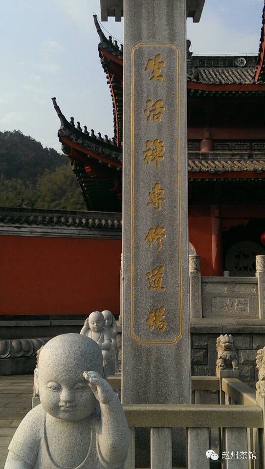大门前整齐地坐着几排可爱的小和尚石像,左右竖起两根华表,左边一根上书“生活禅专修道场”。生活禅是老和尚为契势契机而提出的一个口号和禅修方法,老和尚提倡“在生活中修行,在修行中生活”。禅宗讲“佛法在世间,不离世间觉”,佛法不在深山老林中修得的,大道就存在日常生活的一点一滴中,禅味就包含在每个人的一言一行中。