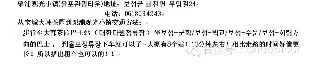 继昨天的宝城大韩茶园和韩国茶博物馆的详细信息介绍后~~今天小全南又给大家带来宝城两天一夜游中栗浦观光小镇和海水绿茶温泉的详细信息!首先温习一下我们宝城两天一夜游的路线!记不住的小伙伴不要忘了时不时温习回顾一下小全南的博客。