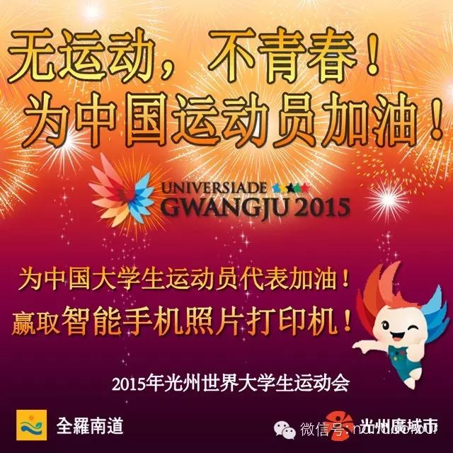 快点点击 http://weibo.com/p/100140Ef19837 ,进入我们微博活动页面为2015年光州世界大学生运动会应援!也为此次参加运动会的中国大学生运动员们喝彩!
