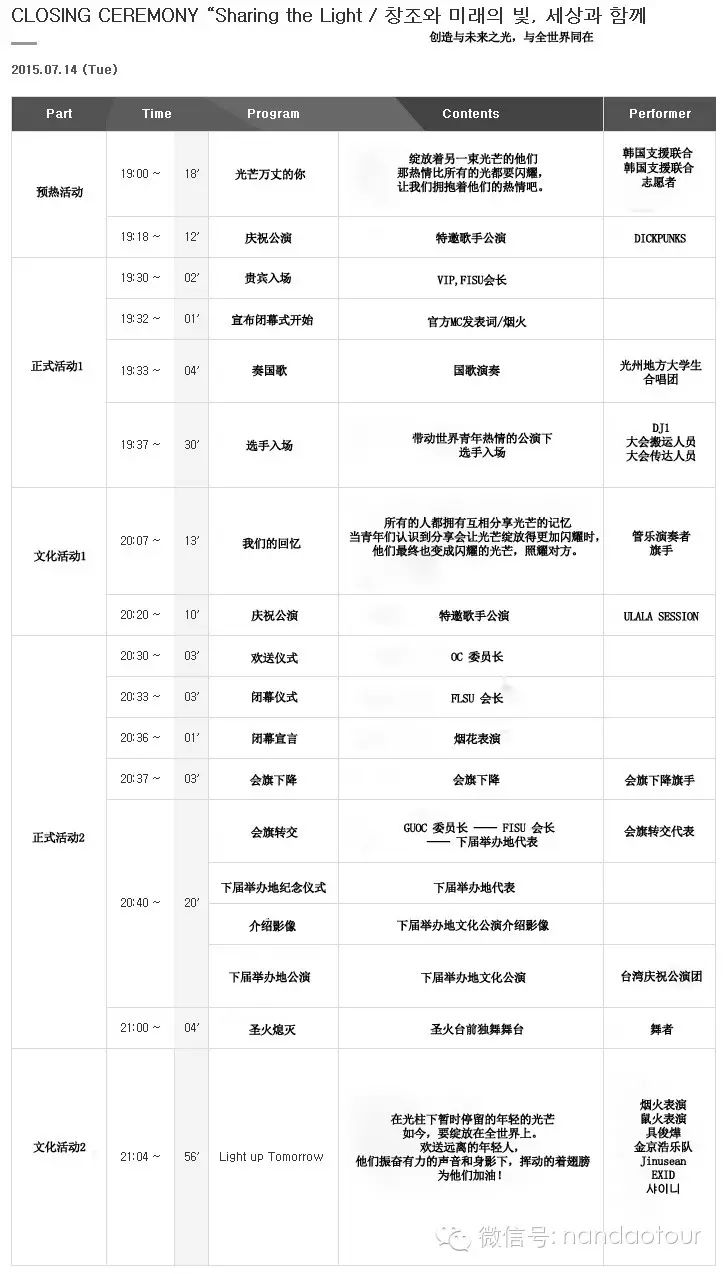 目前官网上发出的2015年光州世界大学生运动会闭幕式日程表,要来的小伙伴预习一下~