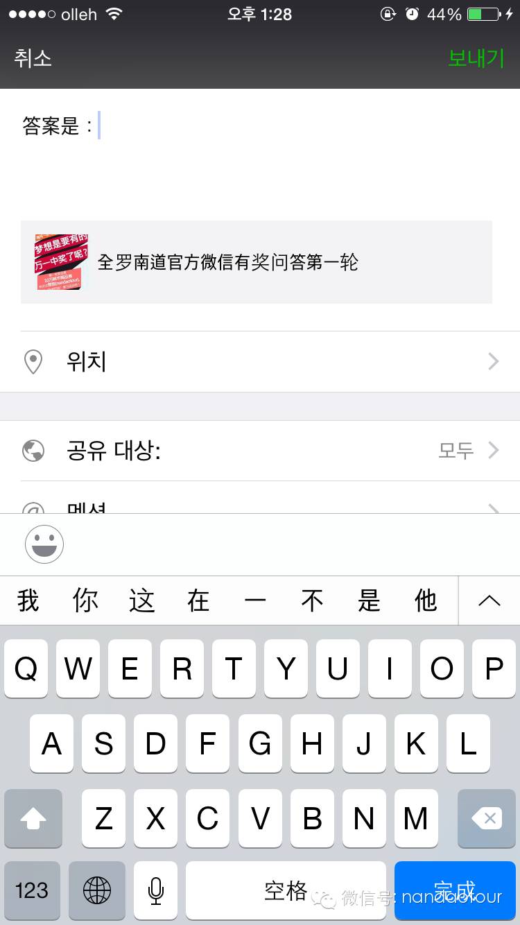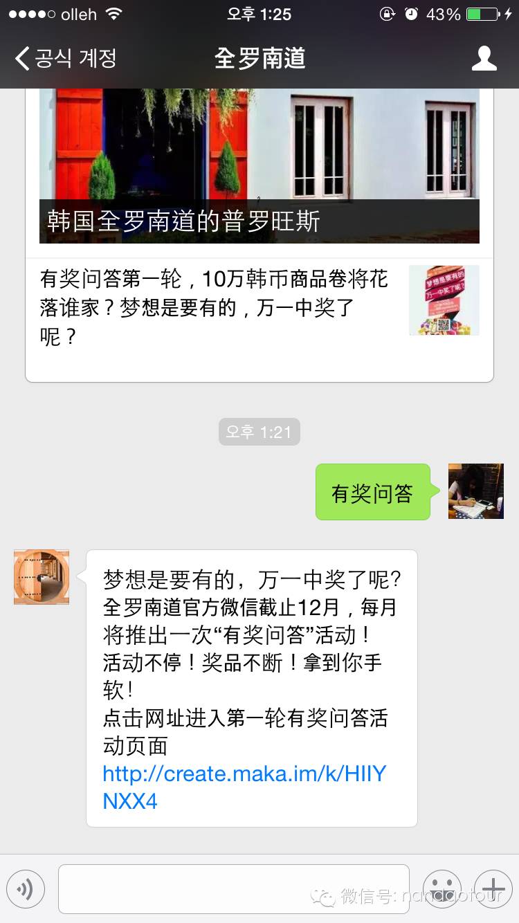“中奖”这个梦想,其实并不难,首先,你要有梦。全罗南道_光州官方微信,即刻起至今年12月份,连续不间断为您提供实现梦想的机会!每月一次“有奖问答”,这次不中,我就不信下次也不中!第一轮的10万韩币商品卷!万一第一轮就不小心中了呢?