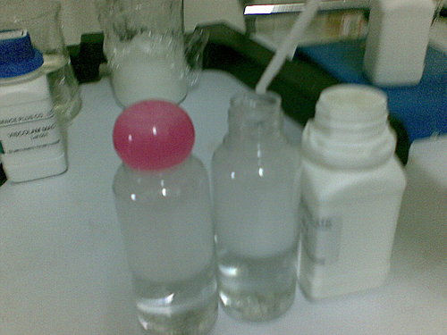 照片一:我先將配方二調配兩罐並快速搖晃後,然後可以清楚的看見瓶子中就會充滿著泡泡,不容易消失。
