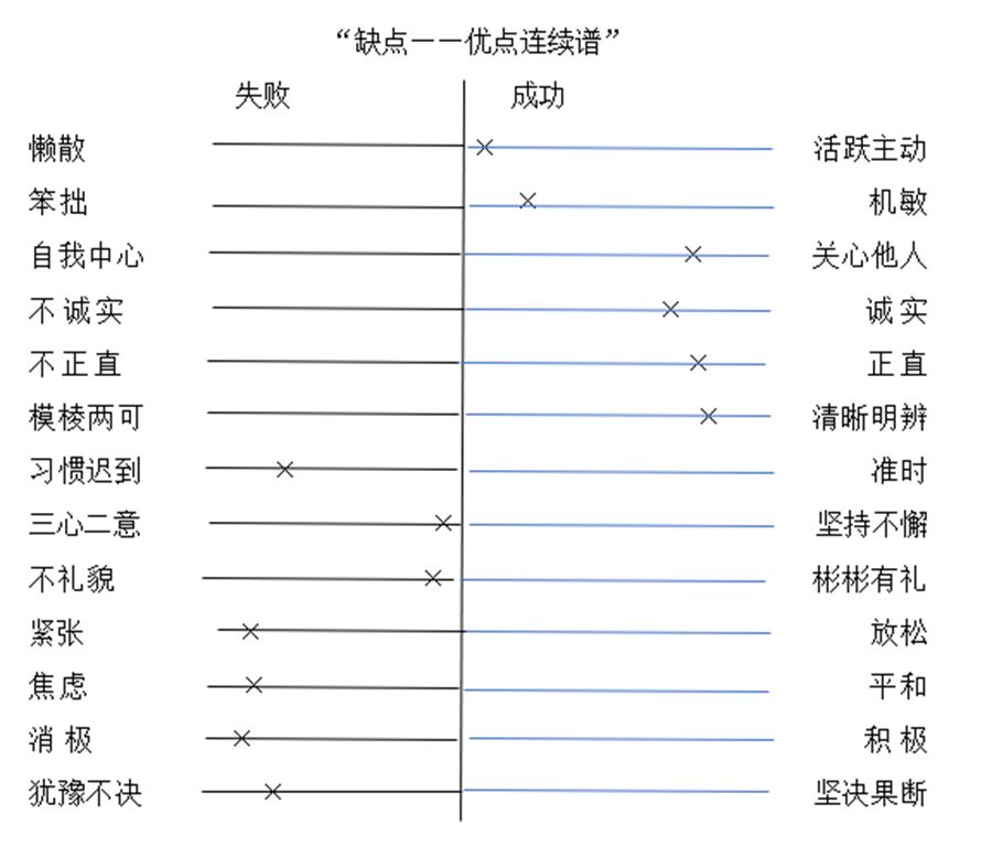 缺乏自信的人往往眼里只有缺点和失败,忽略自己的优点和成功,画连续谱是不错的练习之法。具体方法是:请在纸的中央画上约10厘米的横轴,横轴的左边写上缺点,如“懒散”,右边写上相对应的优点。随后,请在横轴上你认为符合自己情况的位置画叉,如你觉得自己的活跃程度算中等,那你就在正中间画上一个叉;若你觉得自己比起笨拙而言稍显机敏些,那就在中间略偏右的位置画叉。以此类推。在每个横轴上画叉后,请在中央画上一条纵轴,将横轴分为左右各5厘米的长度。如下图所示: