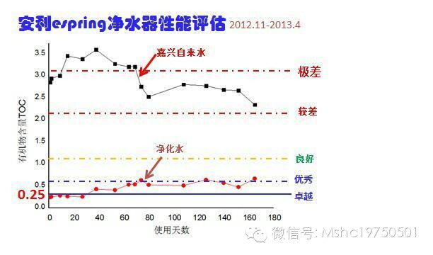 以上实验数据显示:安利益之源净水器在试验期的180天中表现优秀,TOC在0.25-0.5左右,而且水质比较稳定。