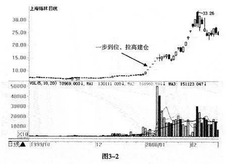 庄家在建仓时采用逼空式的方法,股价在短时期内突然大涨,甚至多个交易日内涨停板。日K线拉出大阳线,股价迅速推到目标位。然后股价在相对高位做平台或旗形、三角形形态整理,形成假出货现象。而庄家在悄悄接纳市场中抛出的筹码,以达到自己建仓的目的。一般这种股票往往是市场中的“黑马”。如如图3-2,上海梅林在2000年1月初,多次涨停,庄家拉高的意图十分明显。