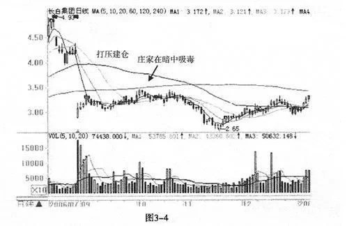 打压方式建仓可以分为直线式快速打压建仓和缓慢震荡打压建仓两种。在直线式打压的过程中,当庄家收集到一部分筹码之后,会快速地把股价大幅度打压下去,有的甚至是打压到跌停板或者是跌停板附近,然后叉快速地将股价大幅度拉起,庄家的目的是制造恐慌性抛盘。在缓慢震荡打压建仓的过程中,股价在下跌的过程会不断地出现反弹的走势,但反弹的力度都比较弱,反弹幅度也是非常有限的。在这个过程中,股价的重心一直处于下移的状态。如图3-4,长百集团采用的就是直线式快速打压建仓的方式。