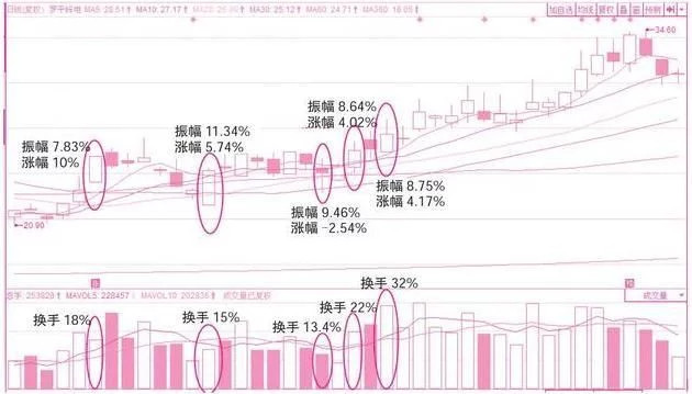 有的股票盘面非常活跃,表示里面有主力资金一直在进出。那么活跃从哪里可以看出来呢?最直接的体现方式就是振幅和换手率。振幅越大,无论是往上还是往下攻击,都表示主力资金攻击性越强。换手率越大,表示越活跃。