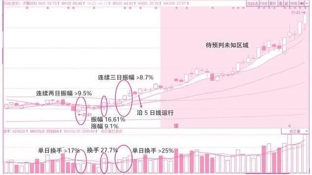 无论换筹或是抢庄,在K线图上的特点就是放巨量,当天的成交量一般至少是过去20天成交量平均数的3倍,或者连续几天密集放量,换手惊人。这种半途抢庄的个股,后期目标位很能很高,但往往主力会有一波凶猛的洗盘。