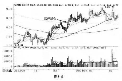 反弹式建仓是庄家为了节省建仓时间经常采用的一种建仓方法。当股价下跌到—个市场低点后,散户见股价已低。惜筹现象严重。庄家无法再次打压股价吸筹。为了节省吸筹的时间,庄家采用股价反弹的方式建仓,即庄家拉高股价,利用市场散户的“反弹出货”或“高抛低吸”的弱点,借此大量吸纳市场外抛出的筹码,以便在较短的时间内收集到大量的筹码,以便完成自己的建仓工作。